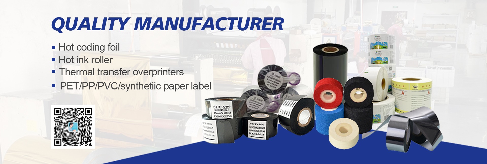 Productos principales:Rollo de tinta caliente, cinta TTO, sobreimpresora de transferencia térmica, máquina de codificación, lámina de codificación caliente